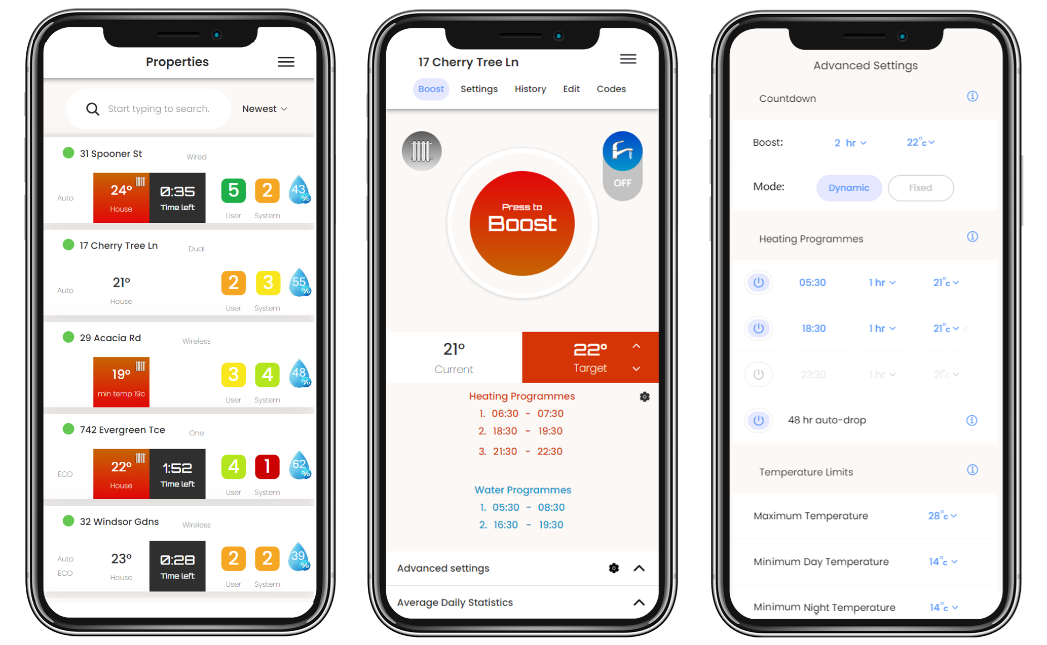 Landlords can boost the heating or hot water remotely for an individual property. Target temperature can be adjusted. Heating schedules and advanced settings can be clearly viewed.