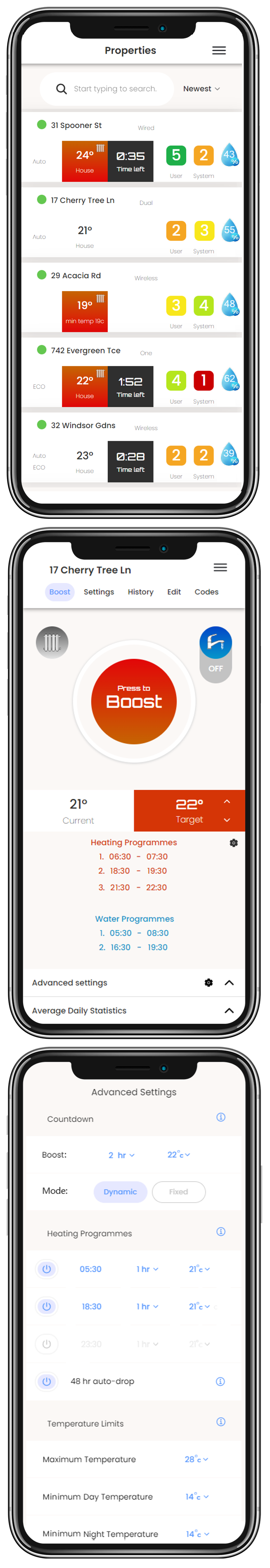 The Landlord App can be downloaded and used with the TIME:O:STAT ONE. There are three main operating screens. From which you can easily navigate your properties, boost the heating and change advanced settings. Compatible with IOS and Android the Landlord App is designed for your phone or tablet. Download from the app store to try the DEMO tutorial.